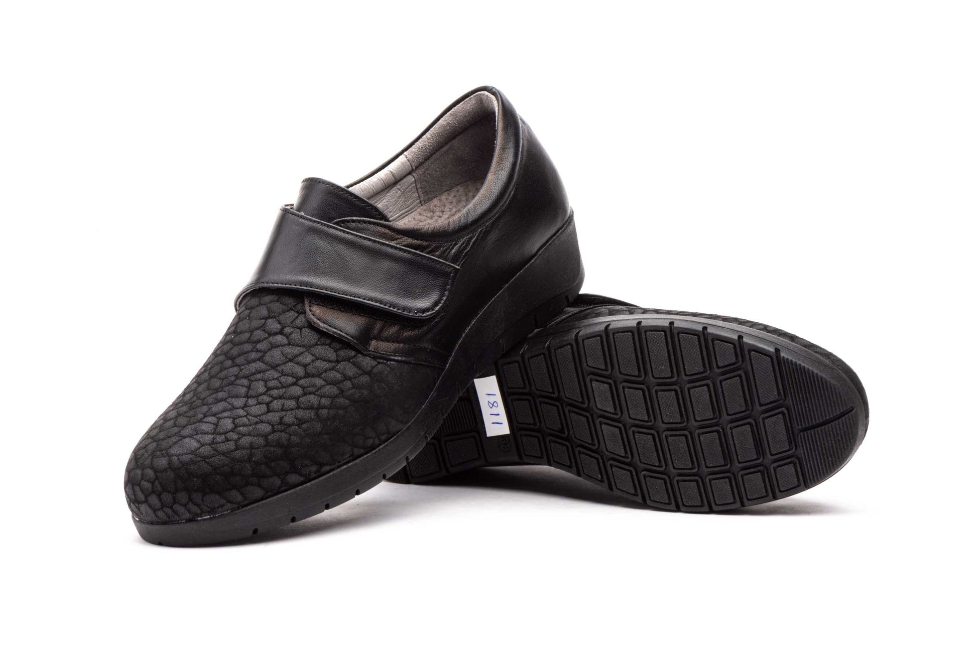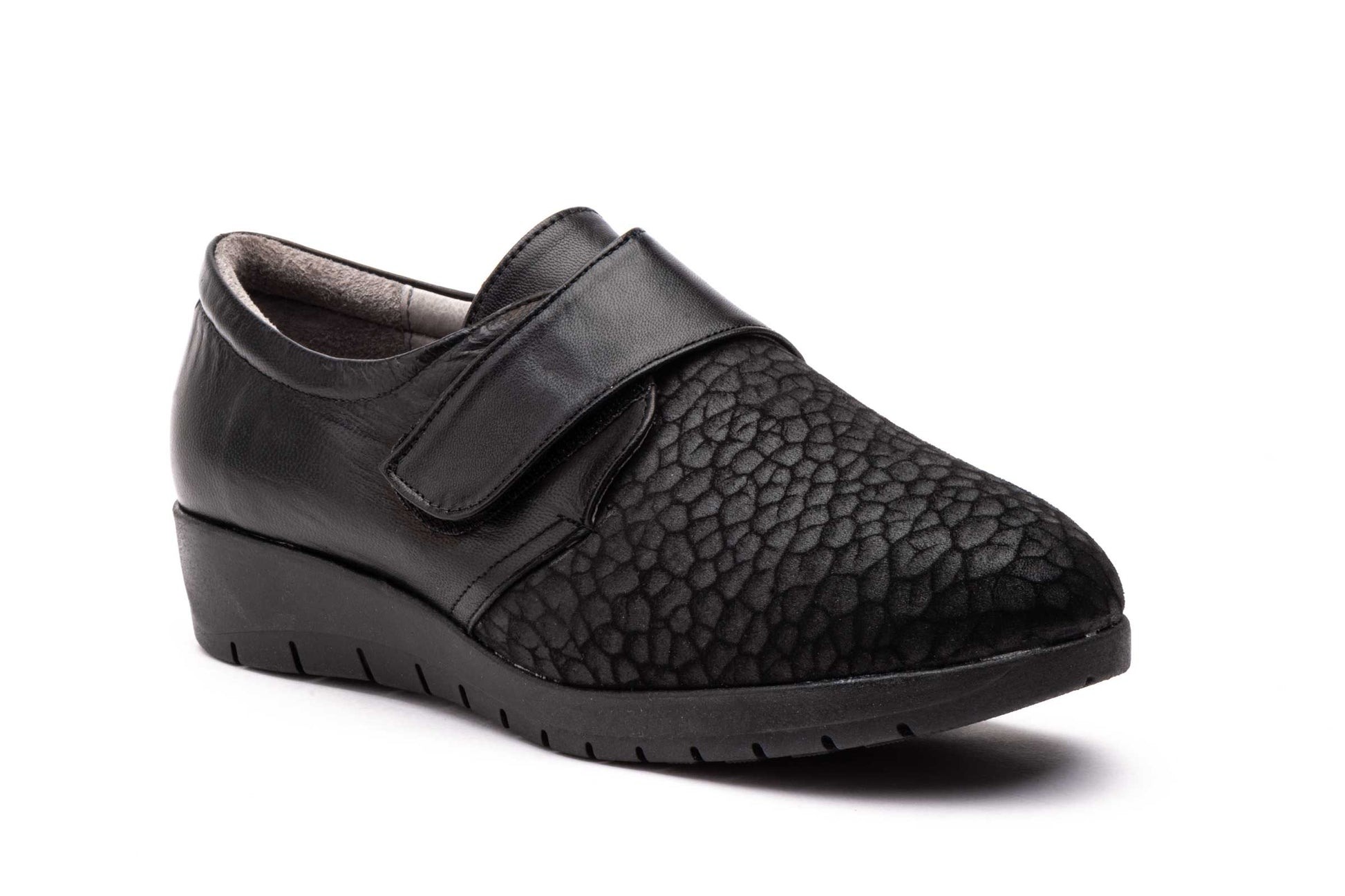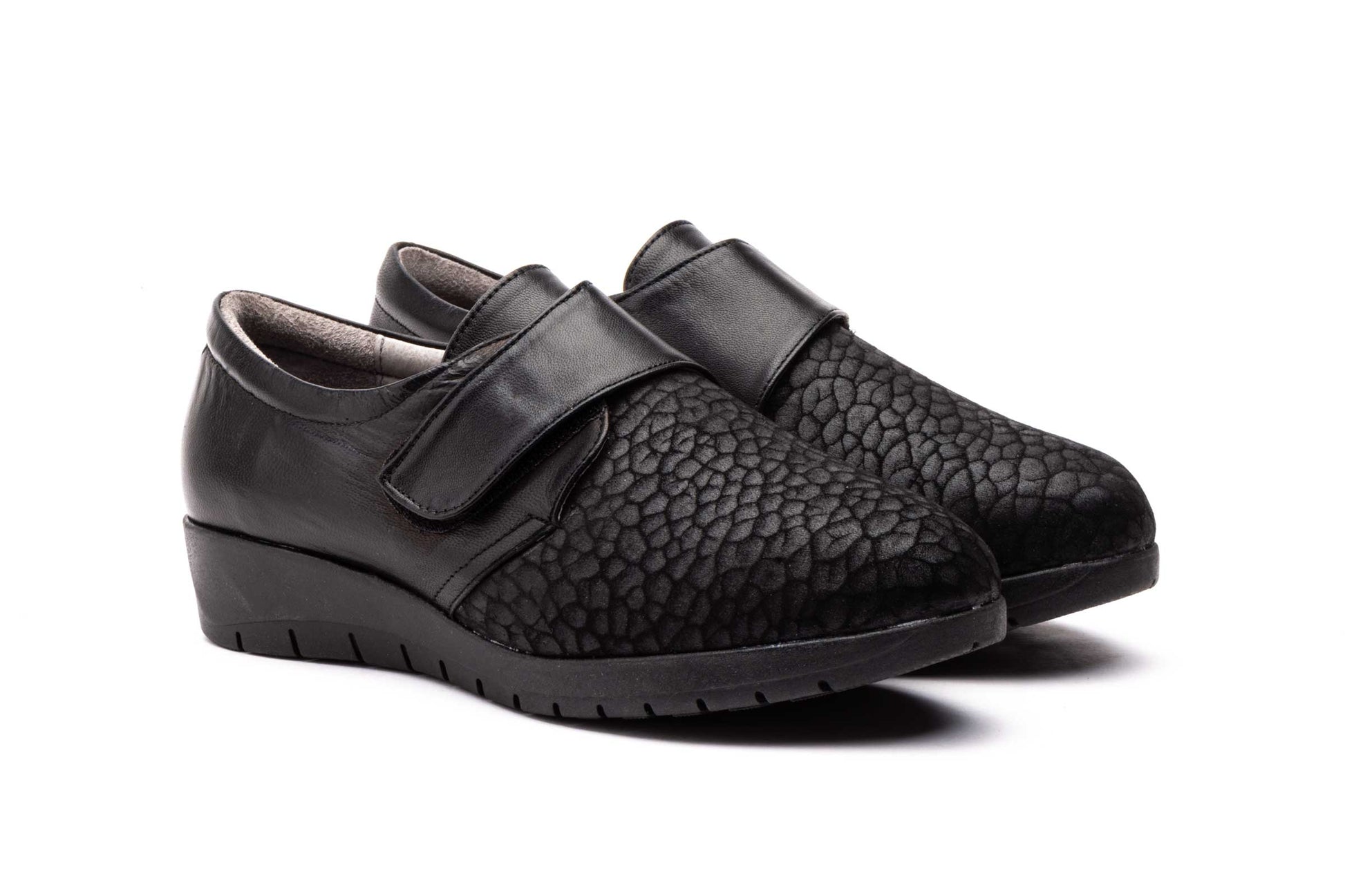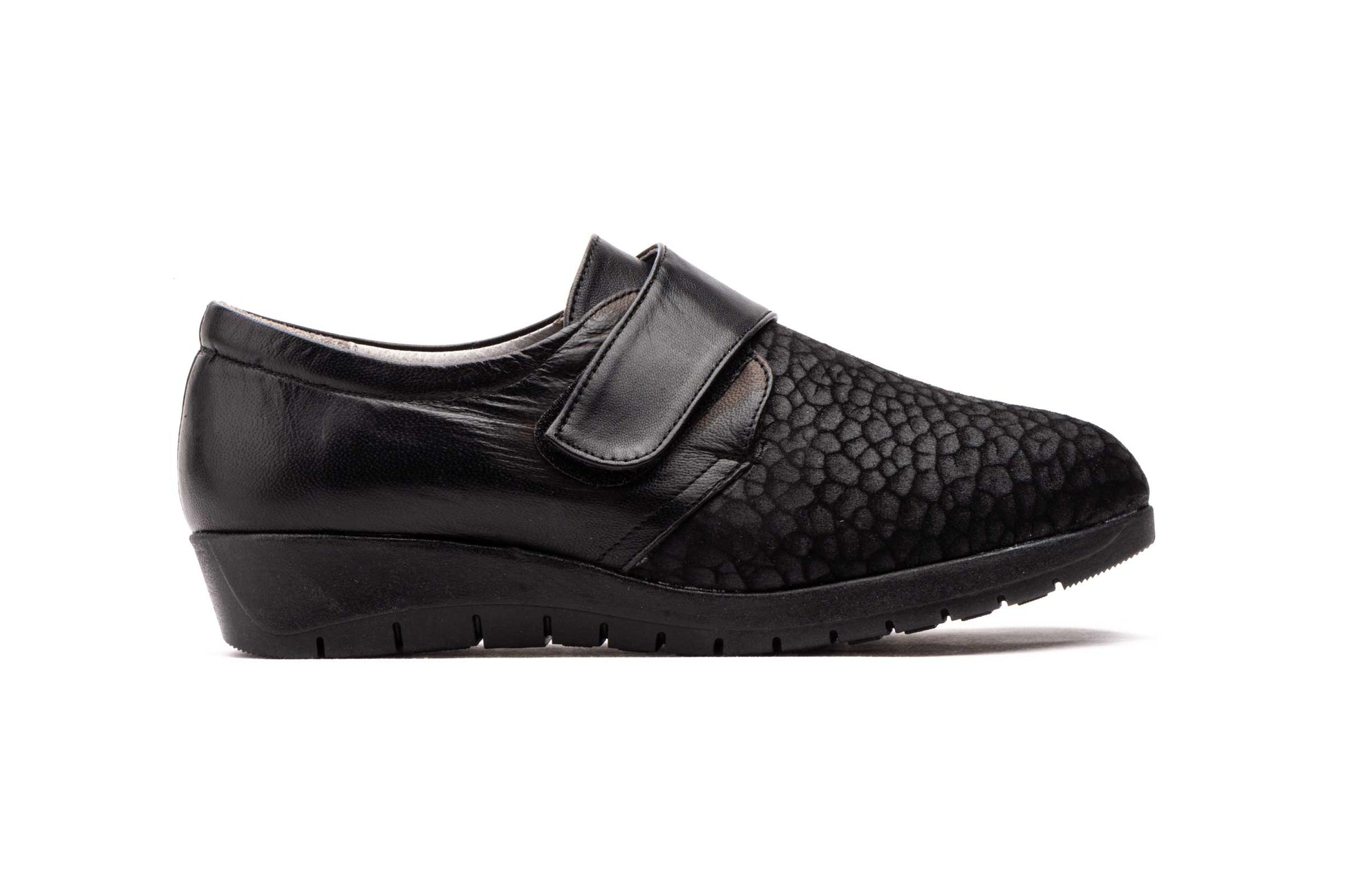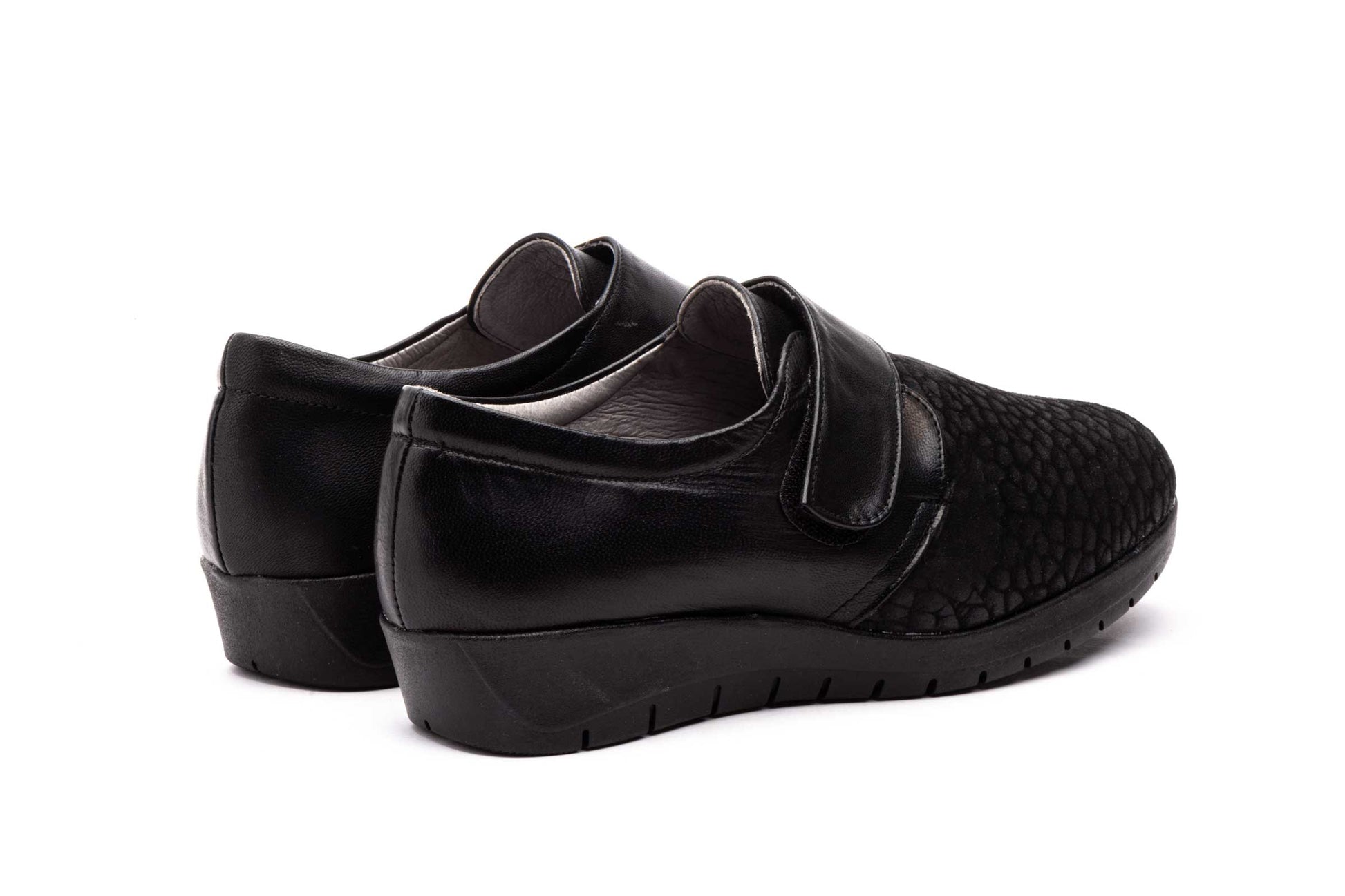Zapatos Mujer Piel Licra Negro Velcro Ancho Especial