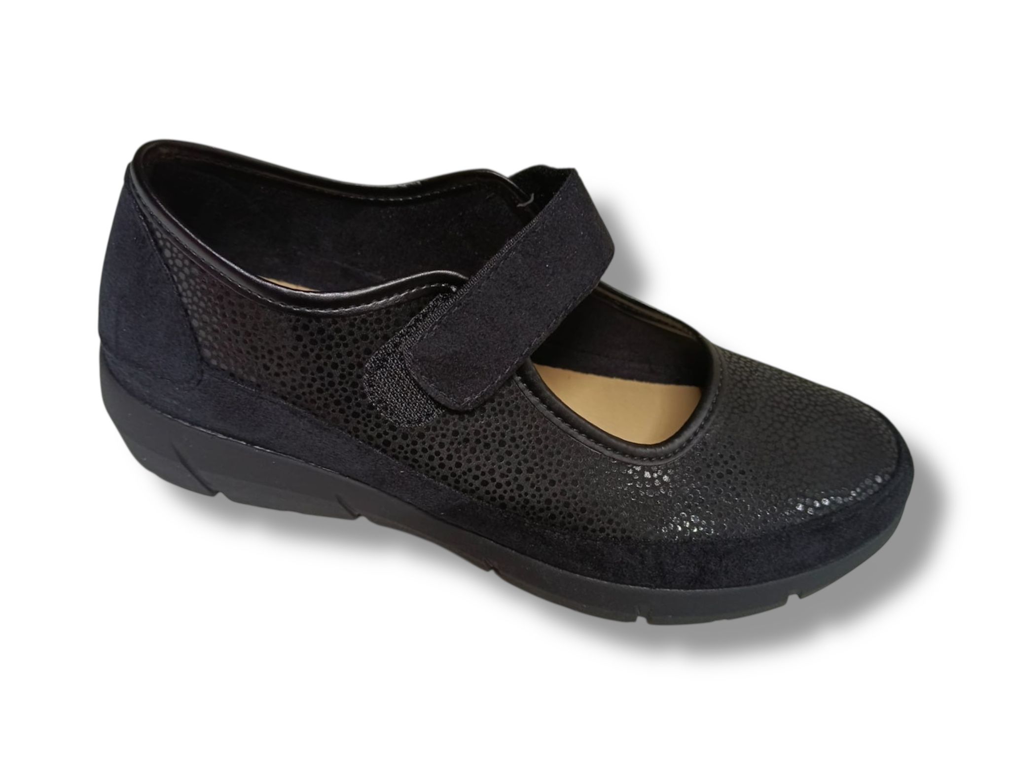 210 Zapato para señora en piel elástica con velcro de color negro ( hecho en España)