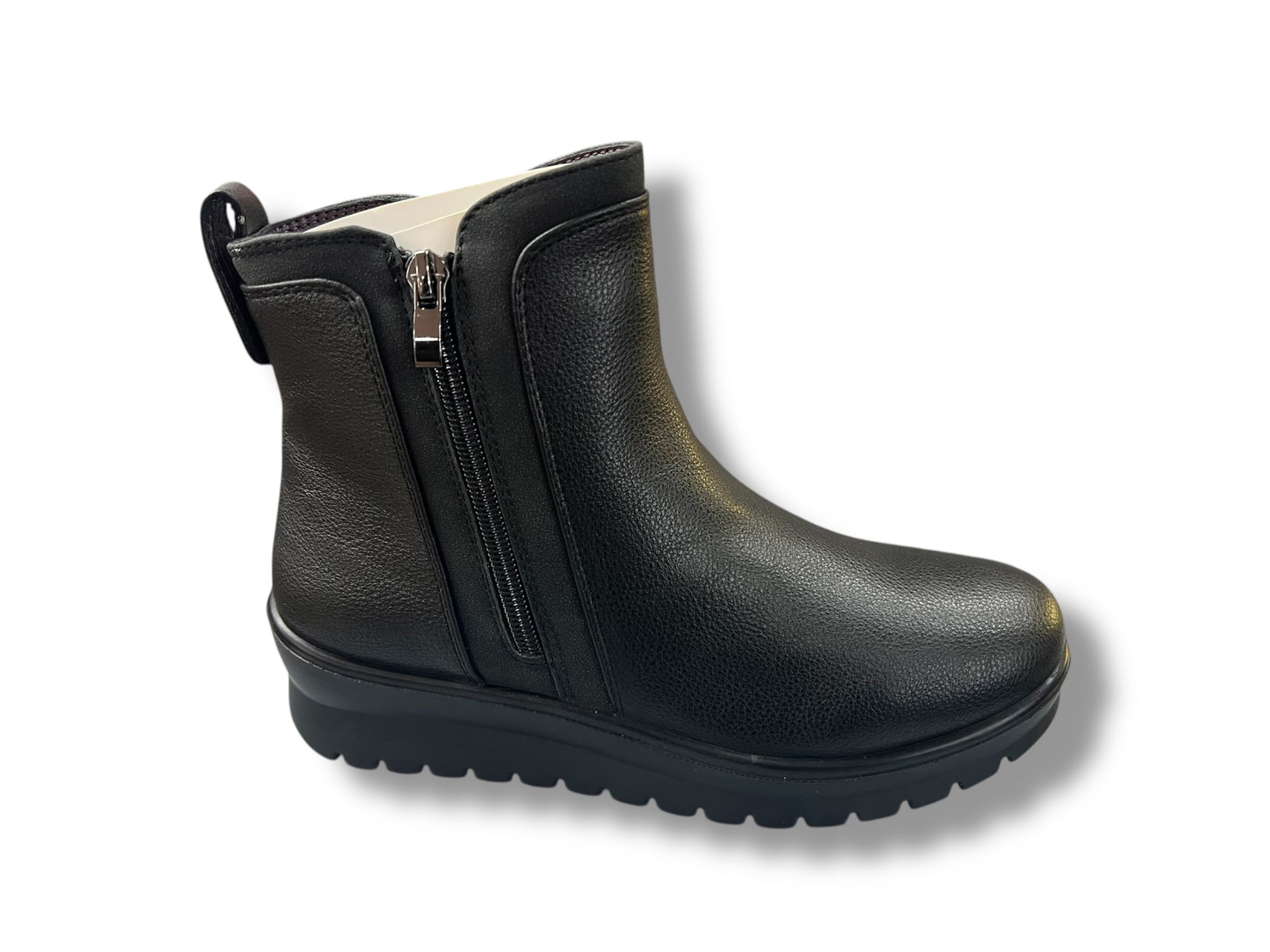 BL-126-6 Botín para señora plano con cremallera lateral de color negro.