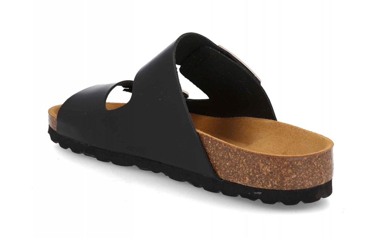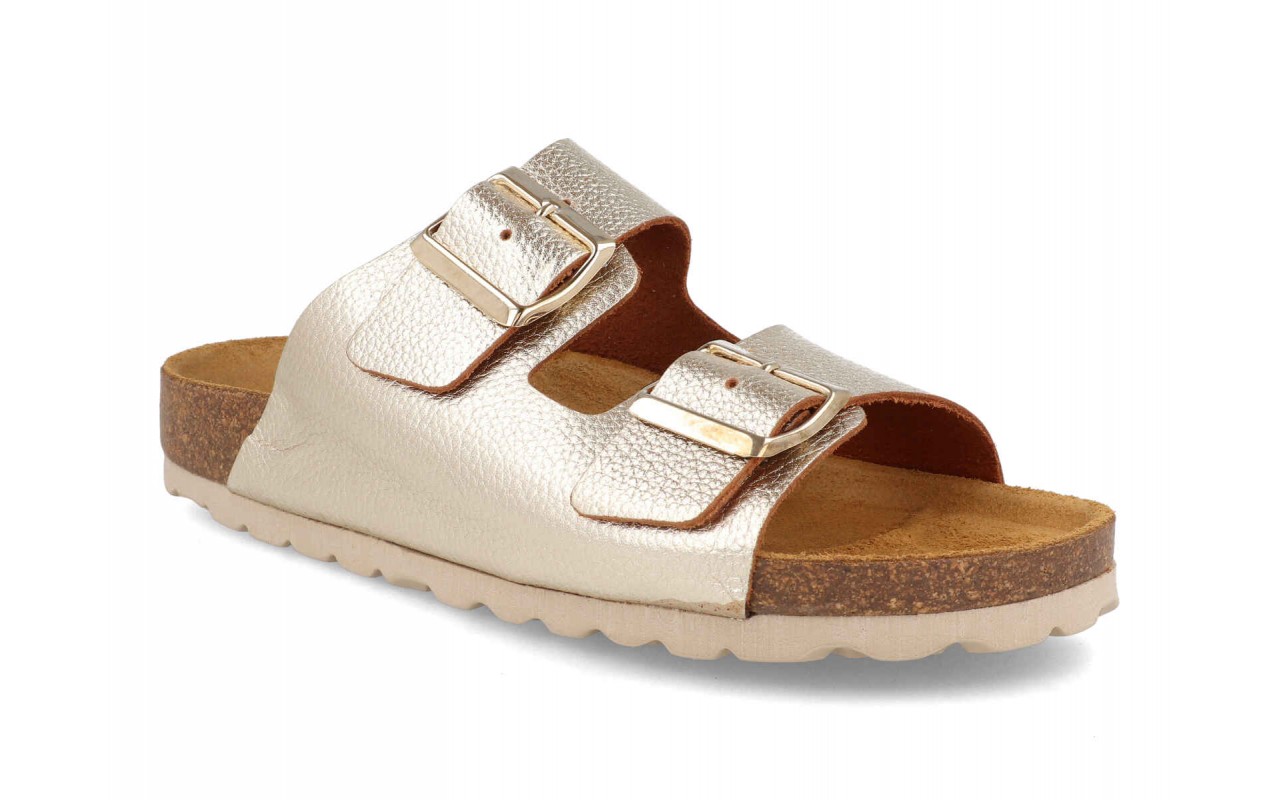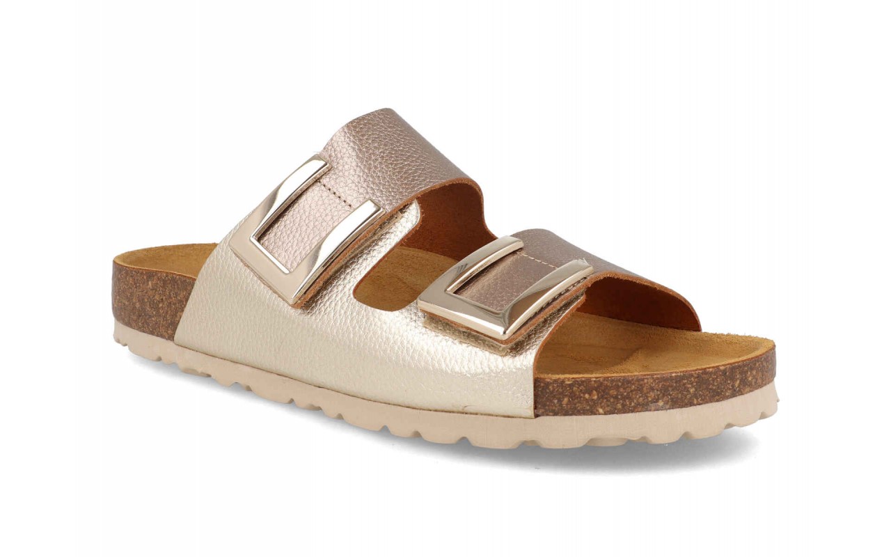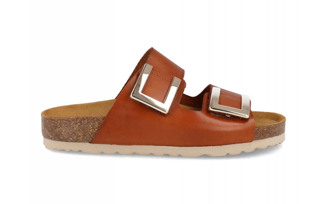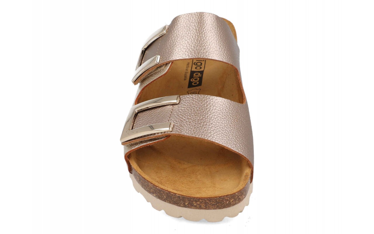 La sandalia tipo bio para mujer modelo 4405 presenta un diseño de corte clásico y funcional que ha sido perfeccionado para ofrecer la máxima sujeción con una estética atemporal. Su estructura se compone de dos bandas transversales de gran anchura que abrazan el pie de forma independiente, permitiendo una adaptación total a la morfología de cada usuaria. Cada una de estas bandas incorpora una robusta hebilla metálica de forma cuadrada que no solo actúa como un elemento decorativo de gran presencia, sino que permite regular el ajuste con precisión milimétrica. Al ser un calzado cómodo mujer, el modelo 4405 prescinde de cierres en el talón, facilitando un calce rápido tipo zueco que resulta ideal para el ritmo de vida actual. La disposición de las hebillas y la amplitud de las tiras aseguran que el pie se mantenga estable y seguro, evitando cualquier deslizamiento indeseado durante la marcha.